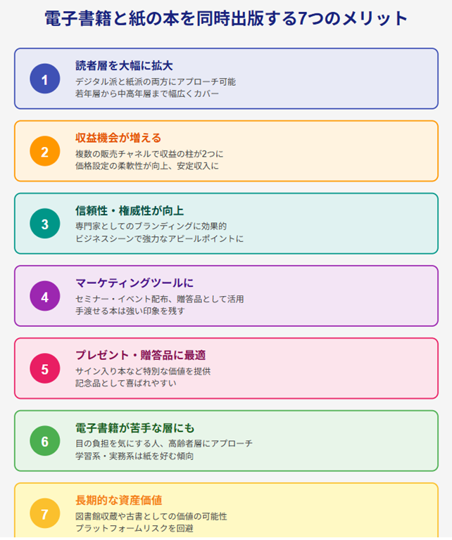 実は、電子書籍と紙の本を同時に出版することには、多くのメリットがあります。読者層の拡大から収益機会の増加、さらには著者としての信頼性向上まで、同時出版ならではの利点が数多く存在します。