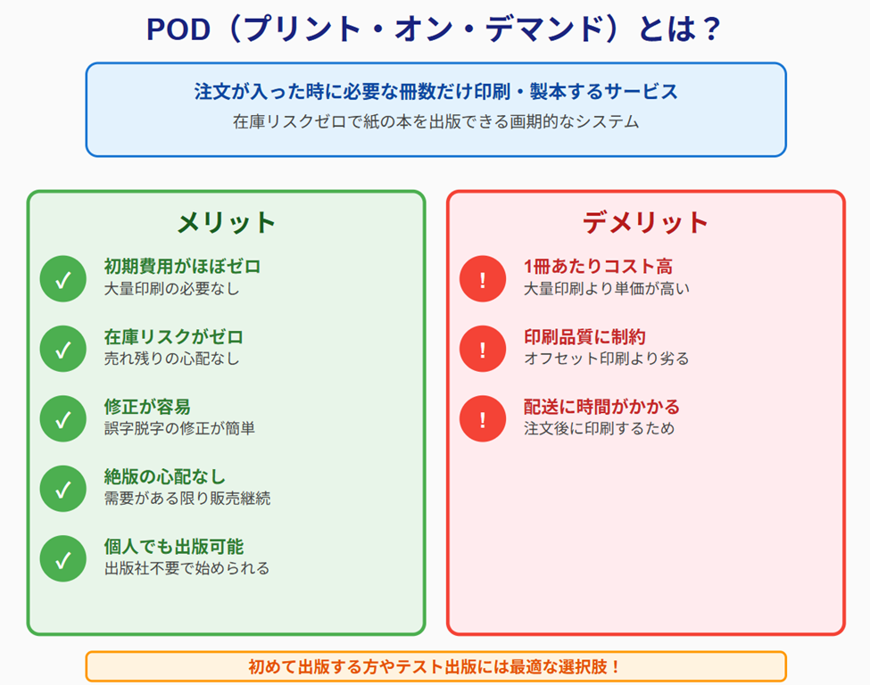 「紙の本を出版するには大量の在庫が必要で、費用もかかるのでは?」と心配する方もいるかもしれません。しかし、現代ではPOD(プリント・オン・デマンド)というサービスがあり、在庫リスクなしで紙の本を出版できます。