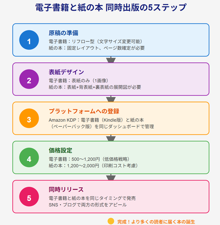 また、価格設定の柔軟性も高まります。電子書籍は500〜1,200円の低価格戦略、紙の本は1,200〜2,000円の中価格戦略というように、読者の予算や好みに応じた選択肢を提供できます。